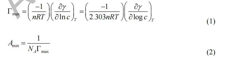通過分析平臺獲得最小表面張力(γCMC)值 地塊的區域。 確定臨界膠束濃度 (CMC) 值 從表面張力的斷點與濃度的對數 曲線。 最大表面過量濃度(Γmax)和最小表面積 (Amin) 在空氣/水界面被每個表面活性劑分子占據的計算公式為 吉布斯吸附方程: