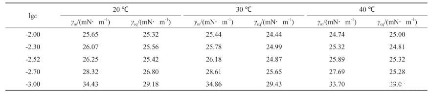 采用JK99C型表面張力儀由低濃度至高濃度測定恒溫后系列溶液的表面張力(γ),做γ-lgc(c為濃度)曲線。測試均在帶有恒溫夾套的玻璃杯中進(jìn)行,外接數(shù)控超級恒溫槽,溫度控制在預(yù)設(shè)溫度,溫度選擇為20,30,40℃。