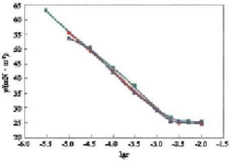 在lgc=-3.00時,可看出較完整的動態(tài)表面張力降低曲線,開始時表面張力接近溶劑的表面張力,隨時間的延長表面張力先快速下降,降至一定數(shù)值后,降幅趨緩,在一段時間內(nèi)基本保持不變。因為氣/液界面新生成時,GSS362尚未在表面吸附,界面張力為溶劑的表面張力,隨著時間的延長,表面活性劑分子開始在表面吸附,氣/液界面張力降低,隨著吸附的進(jìn)行,表面逐步趨于飽和,表面活性劑分子在表面吸附的速率下降,因而動態(tài)表面張力下降速率變慢,趨于平衡。