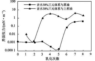 從總體上看,水相與原油間的界面張力低于其與上相油間的界面張力,在乳化第6次以后兩者開始趨同。說明乳化會(huì)導(dǎo)致油相中的組成發(fā)生變化,進(jìn)而導(dǎo)致油相性質(zhì)發(fā)生變化。因此在復(fù)合驅(qū)驅(qū)替的適當(dāng)時(shí)機(jī)應(yīng)對驅(qū)油體系的配方進(jìn)行相應(yīng)調(diào)整。