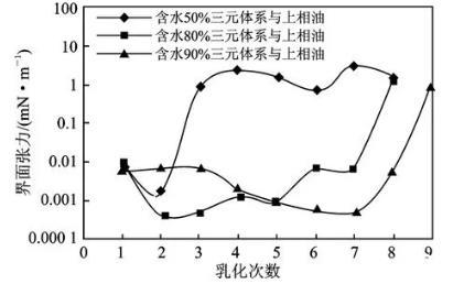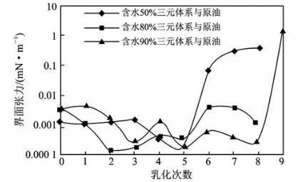 由圖2可知,隨著含水增加,水相與上相油間的界面張力達(dá)到超低的次數(shù)增加,含水50%的三元體系與上相油,第3次以后界面張力不能達(dá)到超低,而含水80%和90%的三元體系分別在第7次和第8次乳化后仍能與上相油間達(dá)到超低。因?yàn)殡S著含水率的增加三元體系表面活性劑和堿的含量更多,表面活性劑、堿與原油之間的比例也更大,因而降低界面張力效果越好[16-18]。